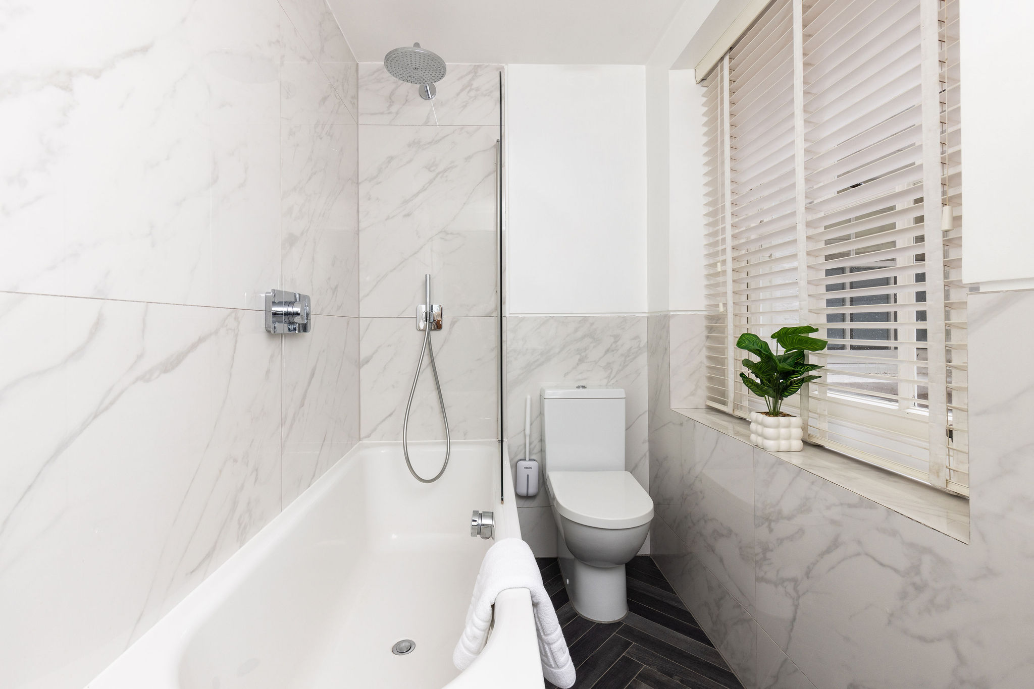 The fully equipped kitchen includes modern appliances such as a dishwasher and full-size fridge, making it ideal for both short and longer stays. A contemporary bathroom with a shower over bath completes the space.